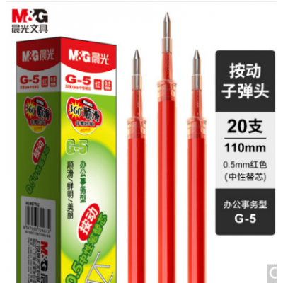 晨光(M&G)文具G-5红色0.5mm按动子弹头中性笔芯 签字笔替芯 水笔芯(K35/S01适用) 20支/盒