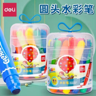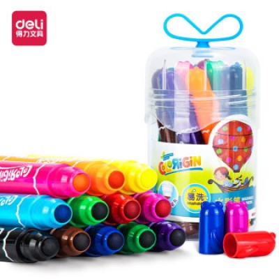 得力(deli)12色易水洗宝宝专用防刺圆头画画笔 儿童软胶提手桶装绘画彩笔 涂鸦笔 幼儿园水彩笔 70727