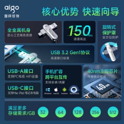 首页 > 信息化设备 > 移动存储设备 > 爱国者(aigo)32GB Type-C手机U盘 U380 高速两用 双接口U盘 USB3.2安卓手机电脑通用优盘