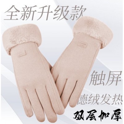 骑行加绒加厚防风触屏毛绒腕口手套冬季新款保暖手套女冬骑车德绒两线标卡混色