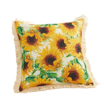 居家卧室床头软包北欧流苏向日葵亚麻印花抱枕套靠枕家用沙发抱枕Z27流苏向日葵图案随机45*45cm含芯