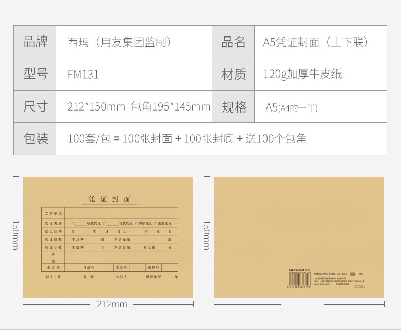 西玛A5凭证封面 财务会计记账凭证纸装订封皮 A5凭证盒费用报销单原始凭证粘贴单 A5凭证封面100套(含包角) FM131