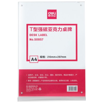 首页 > 办公用品 > 文具 > 得力(deli)T型A4竖式透明强磁吸附亚克力桌牌/展示牌/台卡/酒水牌 50857