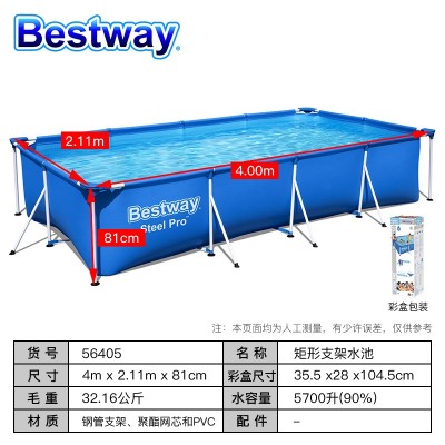 首页 > 装具 > 船帆、风帆和野营用等物品 > Bestway百适乐 儿童成人超大游泳池家庭戏水池洗澡浴池玩耍泳池 56405(400x211x81cm)无过滤泵