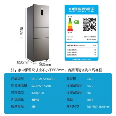 美的(Midea)247升冰箱节能低音中幅宽门 变温三门三温家用电小冰箱BCD-247WTM(E)