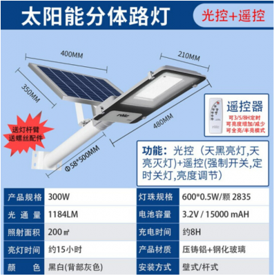 首页 > 建筑建材 > 电工电料 > 太阳能庭院灯大功率室外照明分体路灯高亮门柱庭院户外草坪射灯 新农村防水道路照明灯 300W-光控+遥控-照明面积约200㎡