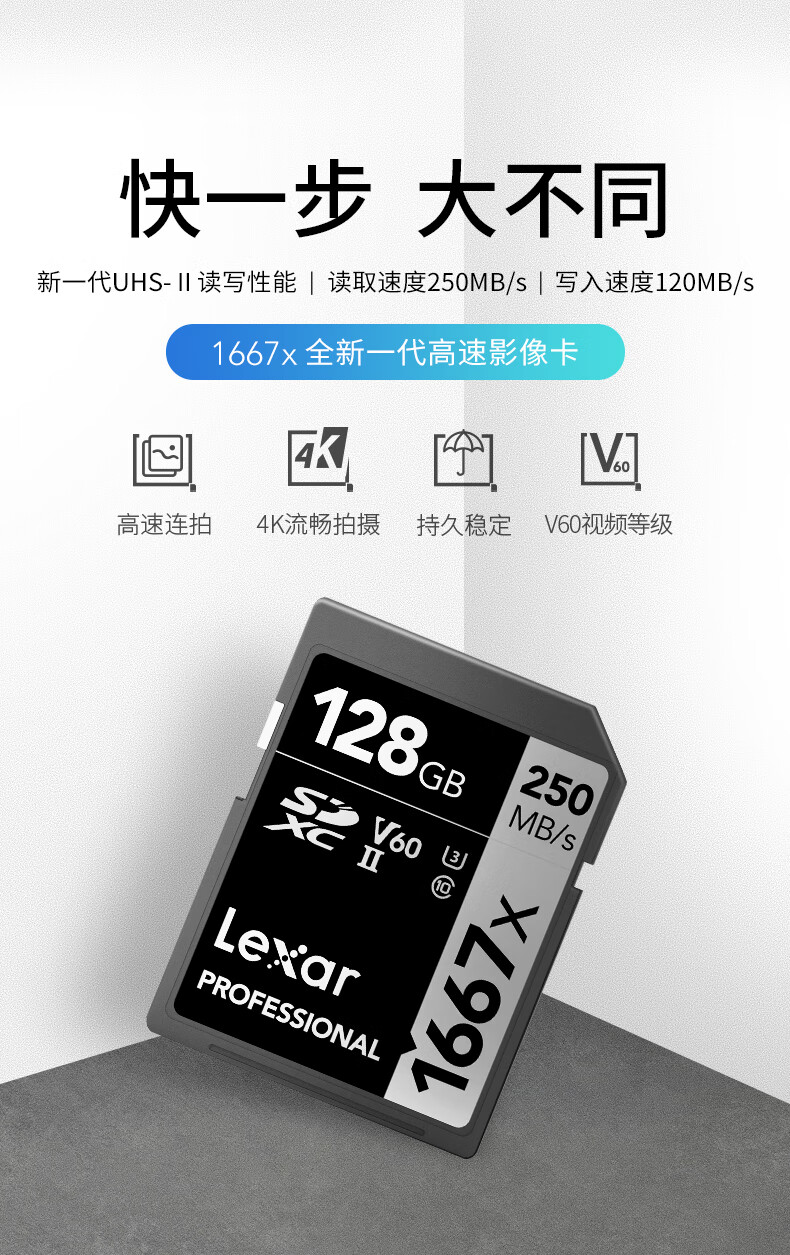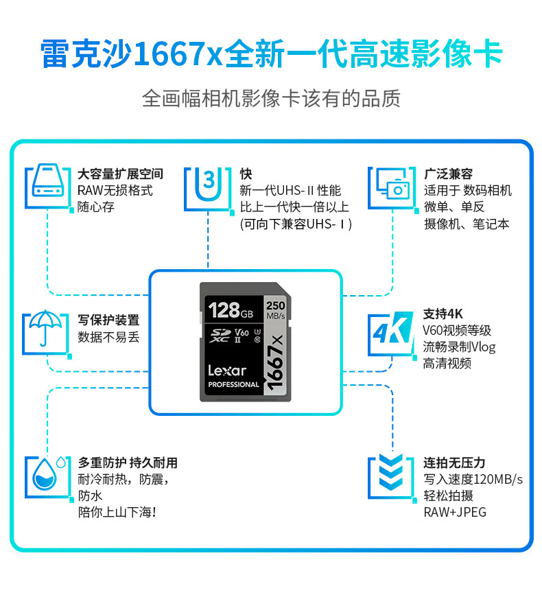 雷克沙(Lexar)SD LSD128CRBCN1667存储卡1667x单反相机内存卡128GB+高速二合一470U读卡器套装