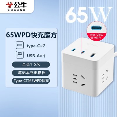 首页 > 建筑建材 > 开关插座 > 公牛(BULL)65W PD苹果快充魔方插座/插线板/插排/接线板 Type-c+USB+3插孔 全长1.5米白色GNV-UU3653