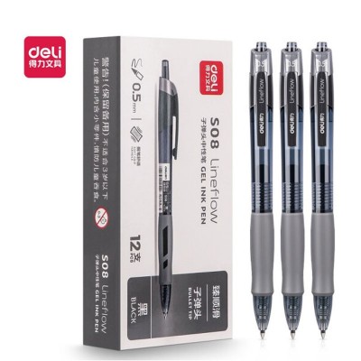 得力(deli)臻顺滑中性笔签字笔 0.5mm子弹头按动笔水笔 黑色 12支/盒S08