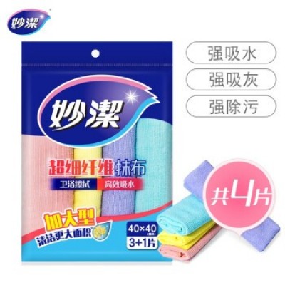 首页 > 用具 > 其他厨房用具 > 妙洁加大超细纤维抹布 吸水清洁布厨房擦桌子巾擦玻璃杯不掉毛4片装40*40cm