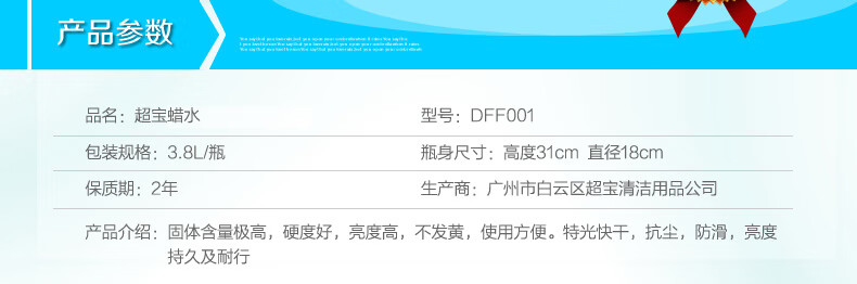 首页 > 装具 > 盥洗、厨房用织物制品 > 超宝蜡水免抛面蜡DFF001上光液体防滑增亮保护地面大理石花岗实木复合水磨石高速抛光3.8升每桶