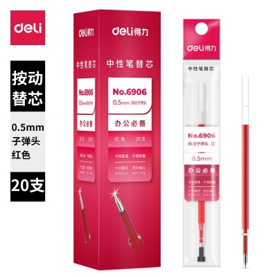 得力6906中性笔芯0.5MM弹簧头(红)(20支/盒)