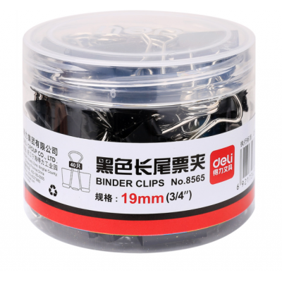 得力8565-5#黑色长尾票夹19mm筒装(黑)(40只/筒)