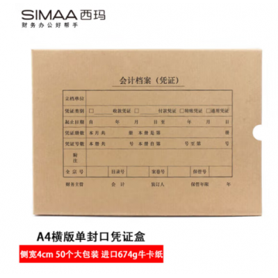 首页 > 办公用品 > 文具 > 西玛(SIMAA) 50个/包 A4单封口横板凭证盒 进口674g牛卡纸 305*220*40mm SZ600336