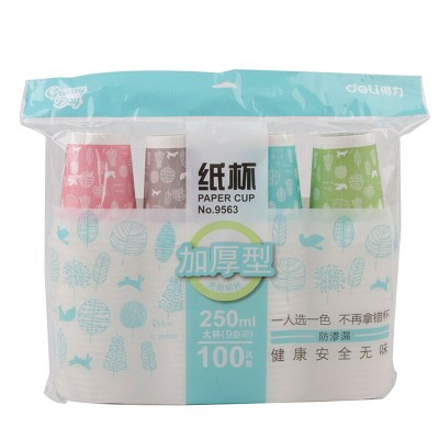 得力(deli)250ml(9盎司)加厚四色一次性水杯/纸杯 100只装 办公用品 9563