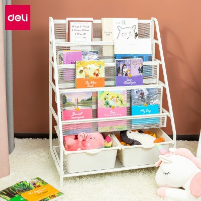 得力(deli)标准型绘本架一体式设计书架 绘本玩具分区收纳 4层绘本层+1层置物层+2个收纳盒白色50501