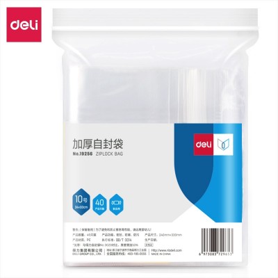 首页 > 办公用品 > 文具 > 得力19256加厚自封袋(24*33cm)10号(透明)(40只/包)
