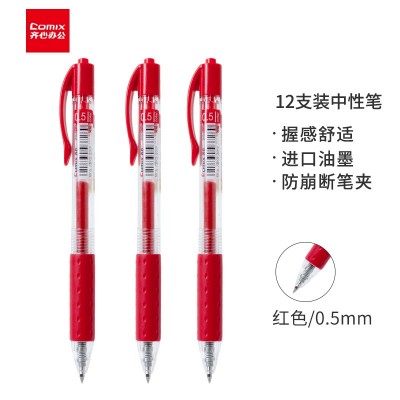 齐心(Comix)12支装0.5mm红色办公按动中性笔水笔签字笔 办公文具 K36