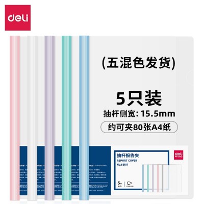 首页 > 办公用品 > 文具 > 得力(deli)5只A4透明拉杆夹文件夹 15.5mm背宽彩色抽杆夹报告夹 学生考试收纳 混色随机63107