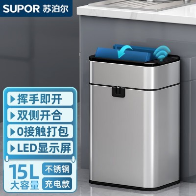 苏泊尔(SUPOR) 不锈钢高端液晶屏智能感应垃圾桶 抽绳一拉打包充电款银色15LSKU:yzwhyp300137