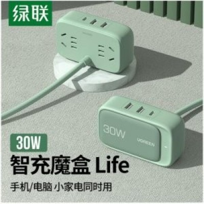 绿联 UGREEN 60699 30W智充魔盒 PD快充头插座接线板二合一 绿色 SKU:yzwhyp101318