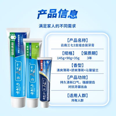 云南三七 牙膏钜惠装145g+90g+35g(清爽薄荷+舒爽薄荷+沁馨留兰) SKU:yzwhyp200887