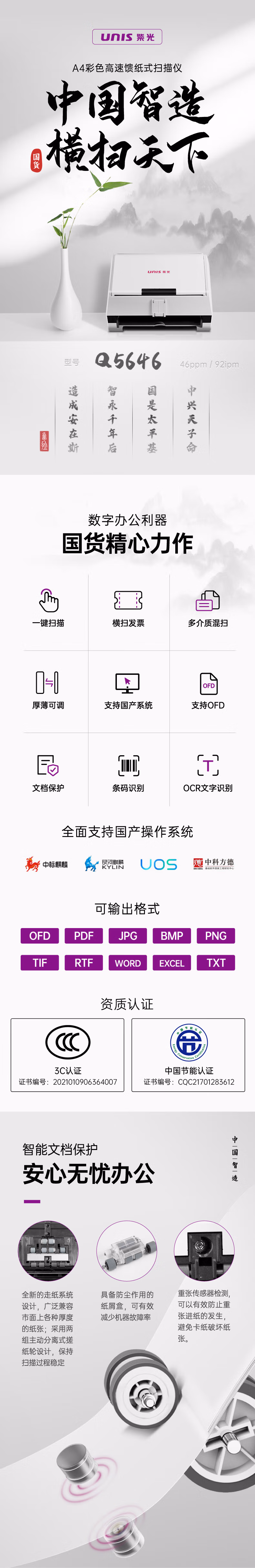 紫光(UNIS) Q5646 国产自动连续双面A4馈纸式高清高速 46页92面/分 证件混扫不撕边横扫发票 质保终身扫描仪 SKU:yzwhyp101669