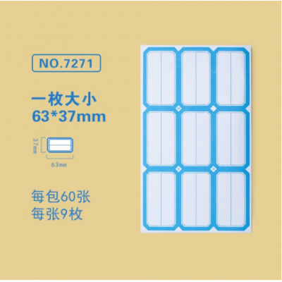首页 > 办公用品 > 文具 > 金隆兴7271-1标签贴纸 自粘性口取纸 9枚/张 60张/包 63*37mm 分区式蓝色 5包装 SKU:yzwhyp102338