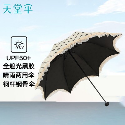 天堂伞 三折雨伞黑胶防晒晴雨伞公主伞55cm*8骨 圆点米黄 SKU:yzwhyp304639