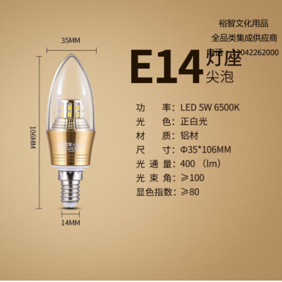 雷士(NVC)LED灯泡尖泡 5瓦E14小螺口 光源节能灯 正白光6500K 5只装 SKU:yzwhyp305174