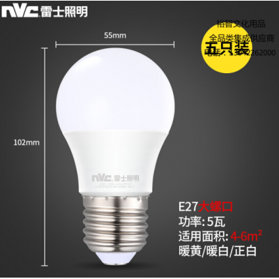 雷士(NVC)LED灯泡球泡 5瓦E27大螺口 光源节能灯 三色调光 5只装 SKU:yzwhyp305243