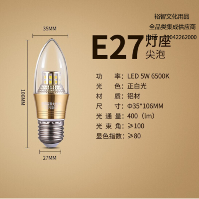 雷士(NVC)LED灯泡尖泡 5瓦E27大螺口 光源节能灯 正白光6500K 5只装 SKU:yzwhyp305317