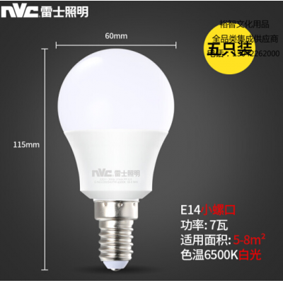 雷士(NVC)LED灯泡球泡7瓦E14小螺口 光源节能灯 正白光6500K 5只装 SKU:yzwhyp305326
