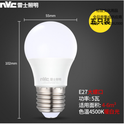 雷士(NVC)LED灯泡球泡 5瓦E27大螺口 光源节能灯 暖白光4000K 5只装 SKU:yzwhyp305339