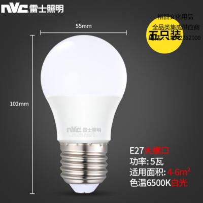 雷士(NVC)LED灯泡球泡 5瓦E27大螺口 光源节能灯 白光6500K 5只装 SKU:yzwhyp305371