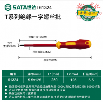 世达 61324 T系列双色柄一字绝缘螺丝批5.5x125MM SKU:yzwhyp105036