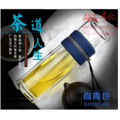 华象玻璃杯 新款茶水分离双层玻璃杯泡茶师男士女士提绳便携玻璃杯 290ml 尚青色 SKU:yzwhyp600902
