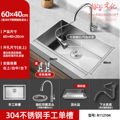 首页 > 用具 > 其他厨房用具 > 荣事达(Royalstar)304不锈钢手工加厚水槽 台下大容量单槽洗菜盆洗碗池配抽拉水龙头 R112104 60*40+抽拉龙头 不含安装 SKU:yzwhyp310176