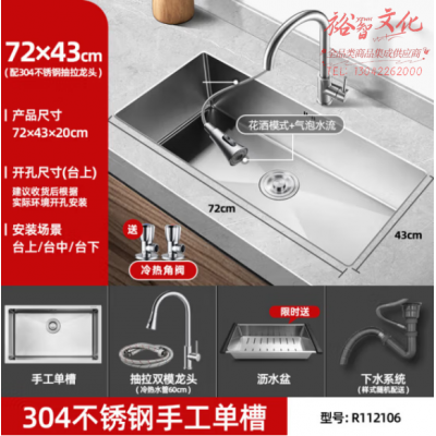 首页 > 用具 > 其他厨房用具 > 荣事达(Royalstar)304不锈钢手工加厚水槽 台下大容量单槽洗菜盆洗碗池配抽拉水龙头 R112106 72*43+抽拉龙头 不含安装 SKU:yzwhyp310177