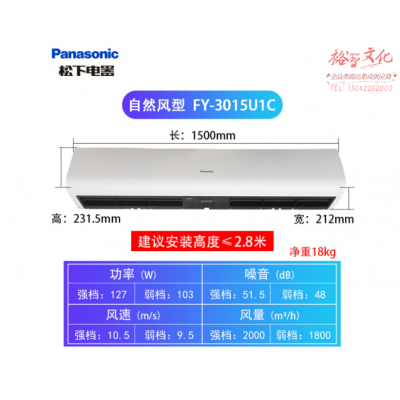 松下FY-3015U1C风幕机 贯流式自然风空气幕 1.5米 建议2.5米门高 SKU:yzwhyp600970