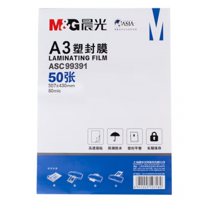 首页 > 办公用品 > 文具 > 晨光A3塑封膜 高清(80mic)50张/包