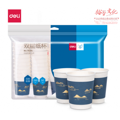 得力(deli)19215双层一次性纸杯 烫金压纹咖啡杯 商务招待厚纸杯 280ml 50只装 蓝色 SKU:yzwhyp105629