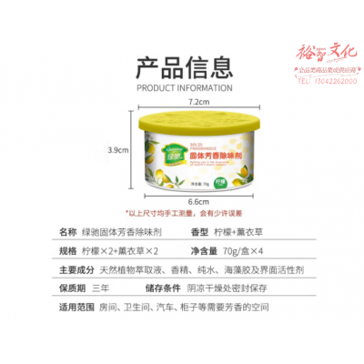 首页 > 建筑建材 > 其他防护用品 > 绿驰 固体空气清新剂(薰衣草*2+柠檬*2) 除味剂 车载香薰 70g*4盒装 SKU:yzwhyp312304