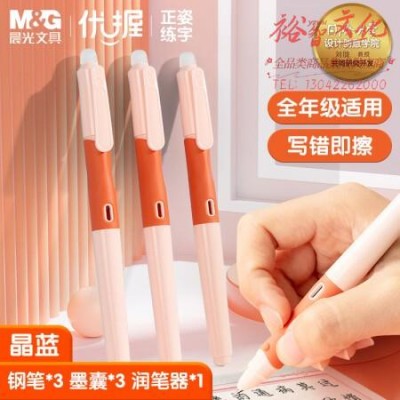 晨光(M&G)HAFP2152 优握热可擦晶蓝正姿钢笔套装(钢笔*3+润笔器+墨囊*3)粉 SKU:yzwhyp107509