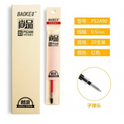 宝克(baoke) PS2490 子弹头畅滑中性笔芯 商务办公/学生考试水笔替芯 0.5mm 20支装 红色