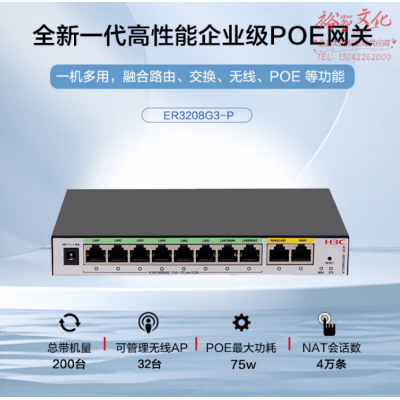 首页 > 信息化设备 > 路由器 > 新华三(H3C)8口POE路由器AC一体机 企业级VPN路由器网关控制器 8个POE供电口/双WAN口/带机200 ER3208G3-P SKU:yzwhyp328332