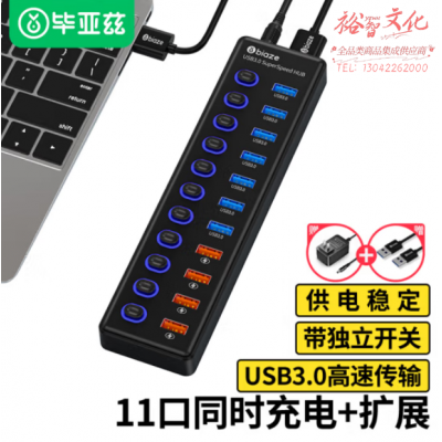 毕亚兹 USB3.0分线器 高速11口拓展坞HUB工业级集线器独立开关 一拖十一转换器带电源供电HUB53 SKU:yzwhyp809176