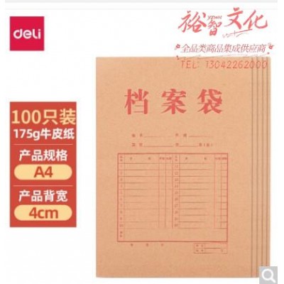 得力(deli) 27048 100只A4混浆175g牛皮纸档案袋票据收纳侧宽4cm标书合同文件资料袋 SKU:yzwhyp824325