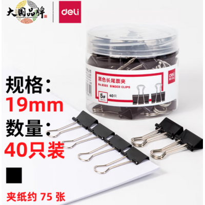 首页 > 办公用品 > 文具 > 得力(deli)长尾夹40只19mm黑色长尾夹票夹 金属燕尾夹票据夹子 办公用品 小号长尾夹8565