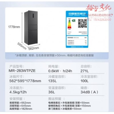 美的(Midea)271升三门大容量智能家用电冰箱小型三开门一级风冷无霜变频低噪双净味租房宿舍小冰箱MR-283WTPZESKU:yzwhyp850485